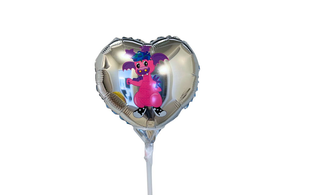 Lítil silfur álblaðra á plast priki. Á annarri hliðinni er bleiki Kærleiksdrekinn okkar og á hinni er græni töfradrekinn!