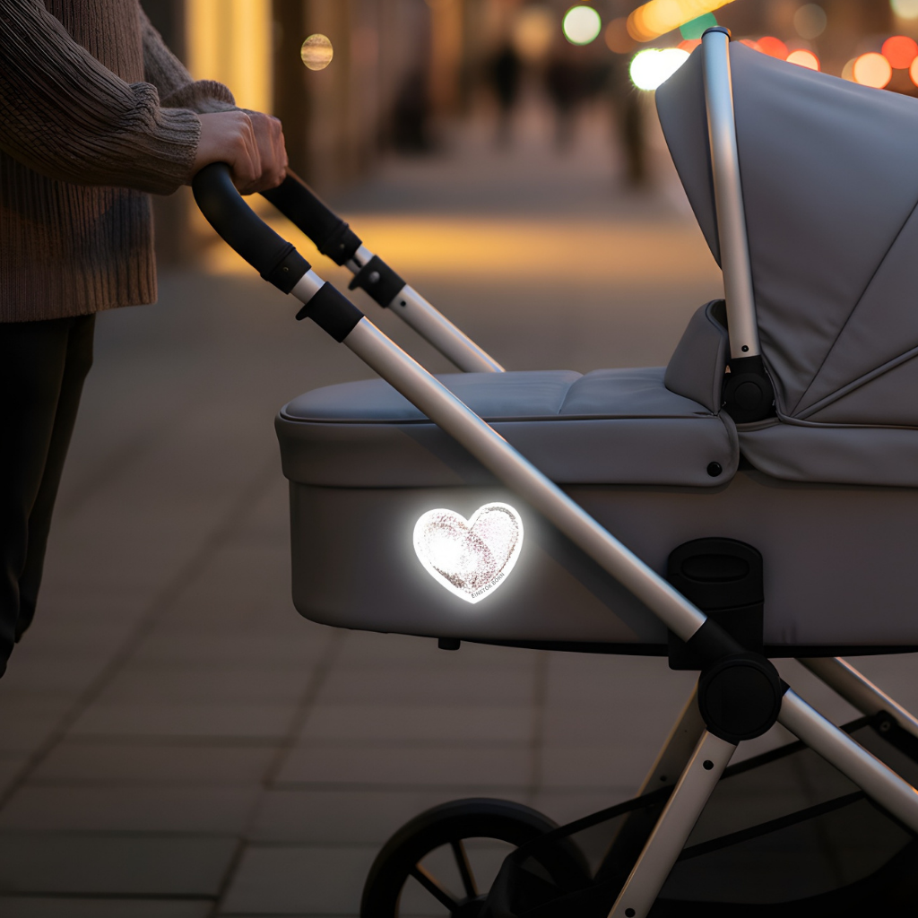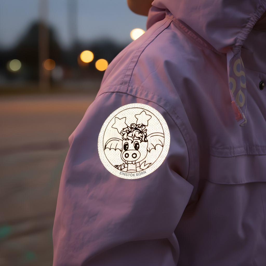 Fjórir endurskins límmiðar sem henta á útiföt, kerrur, hjólahjálma, töskur og fleira.